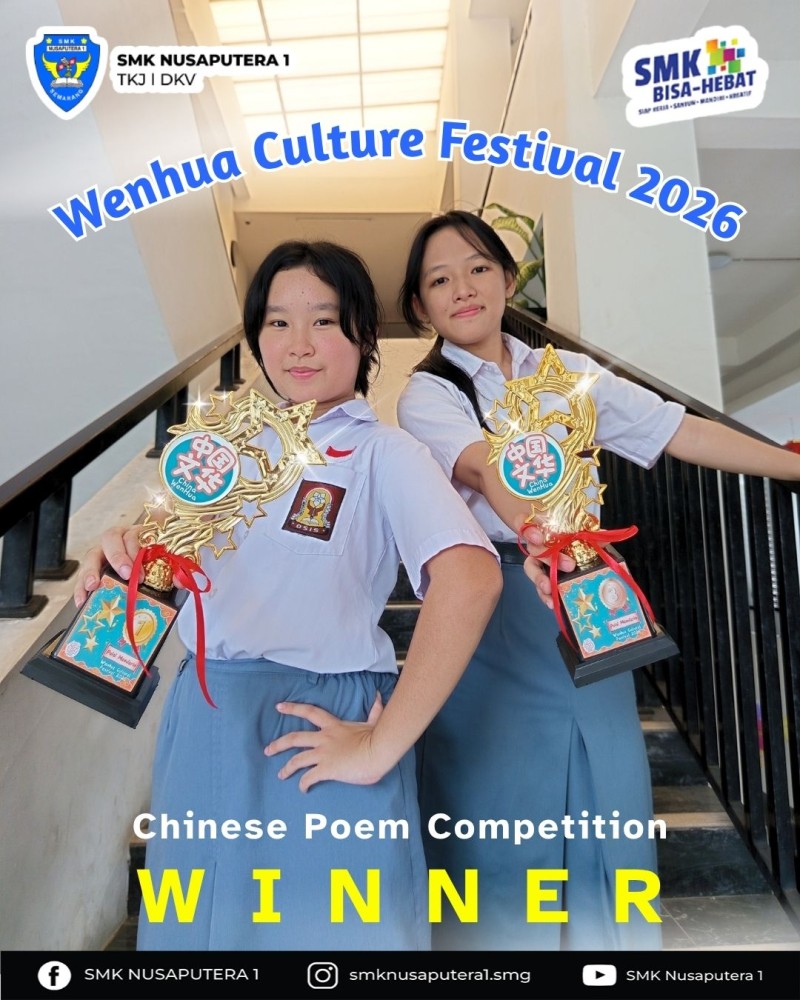 Semarang, 31 Maret 2026 — Siswa SMK Nusaputera 1 kembali menorehkan prestasi dalam ajang Wenhua Culture Festival 2026 yang diselenggarakan secara daring. Dalam kompetisi ini, para peserta berpartisipasi pada kategori menyanyi lagu Mandarin dan melantangkan puisi (recitation).